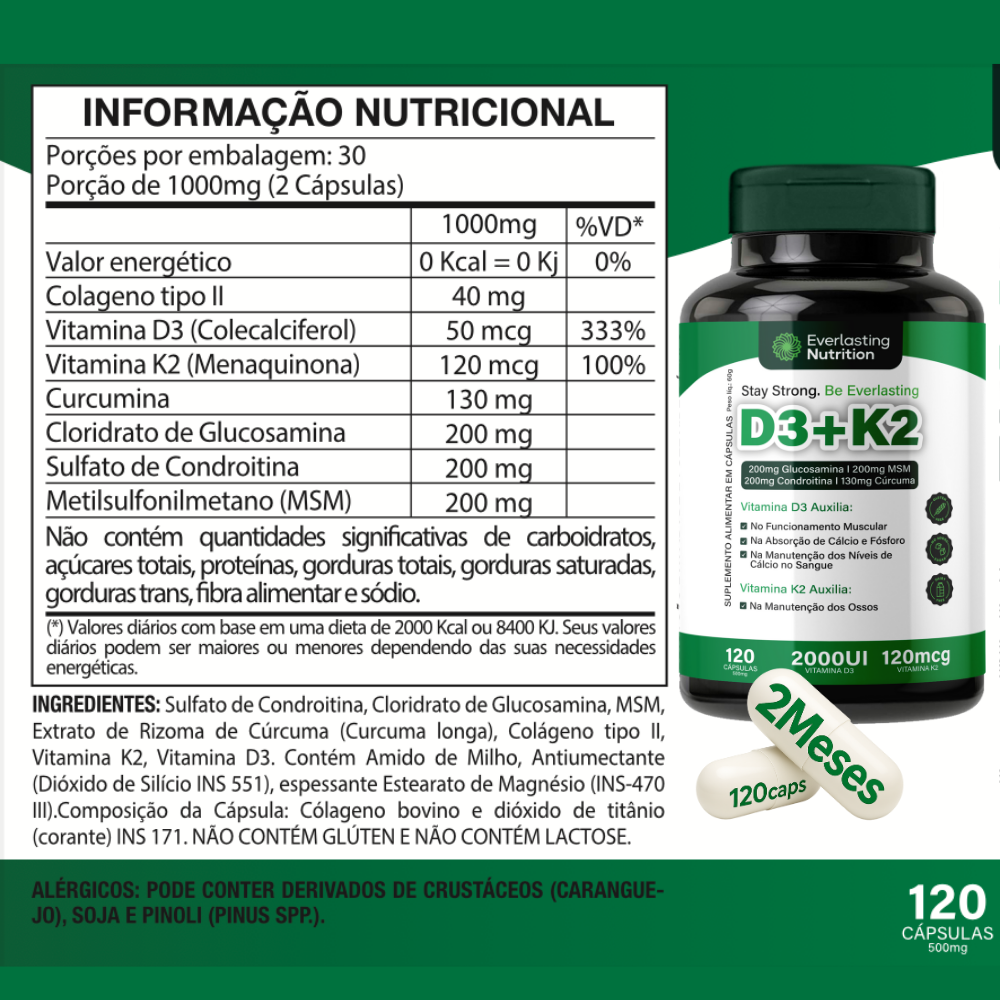 Vitamina D3 + K2 com Colágeno Tipo 2 e Glucosamina – 120 Cápsulas – Everlasting Nutrition