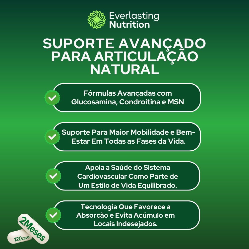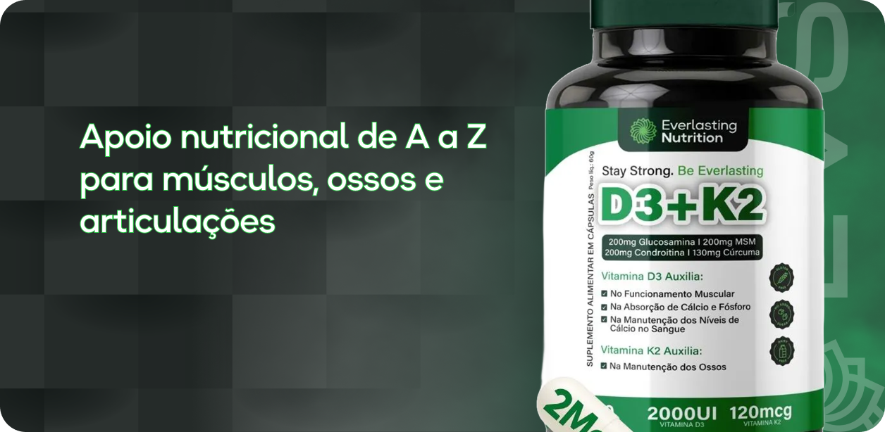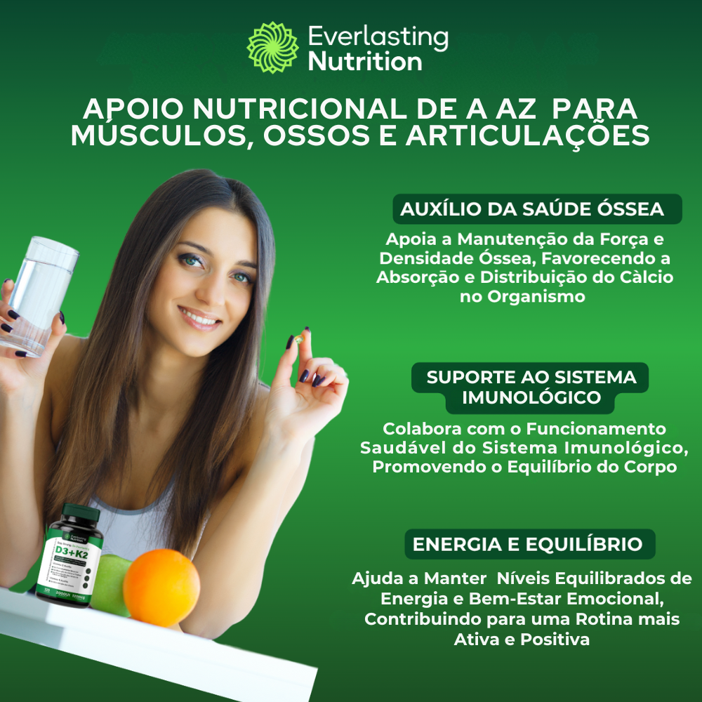 Transforme seu dia a dia e mantenha suas articulações saudáveis! Inicie sua jornada de bem-estar com o Complexo Articular D3 + K2 da Everlasting Nutrition.