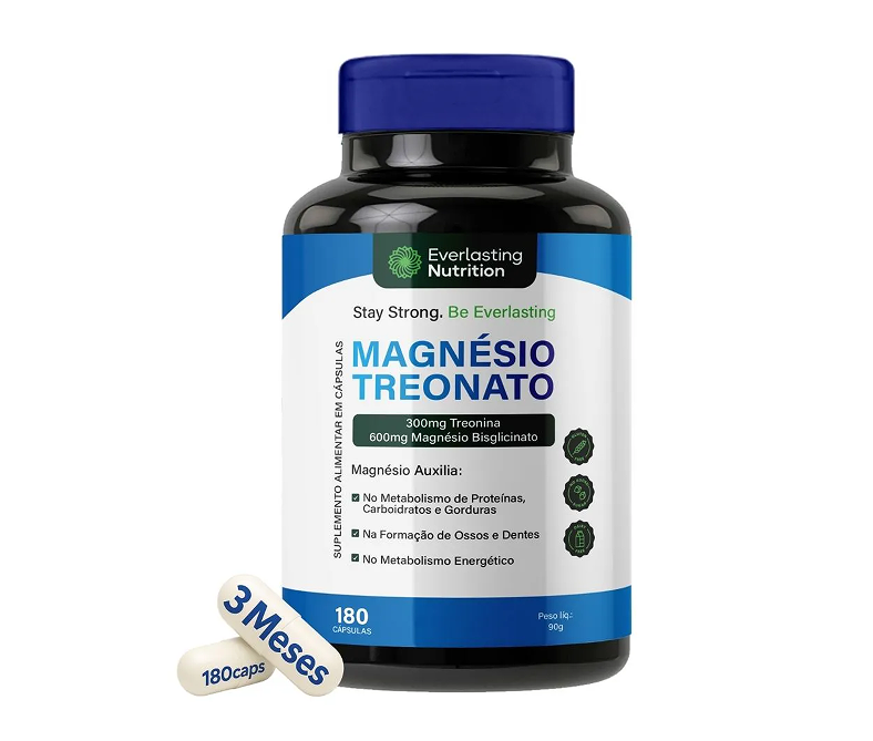 O Magnésio Treonato da Everlasting contém 300mg de Treonina e 600mg de Bisglicinato de Magnésio Essa fórmula é ideal para quem busca melhorar memória, foco e função cognitiva, com absorção otimizada pelo organismo.